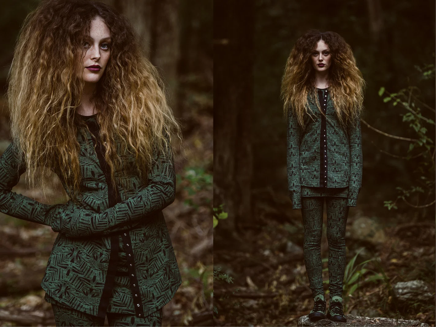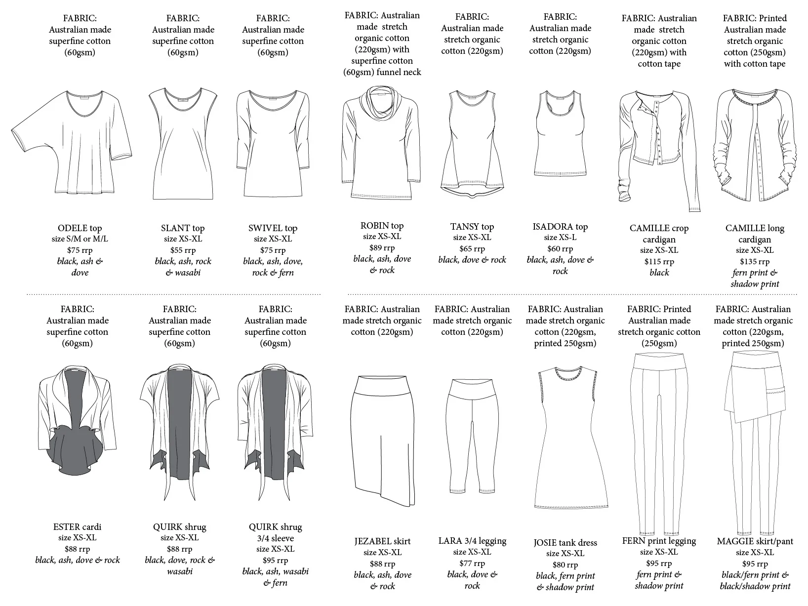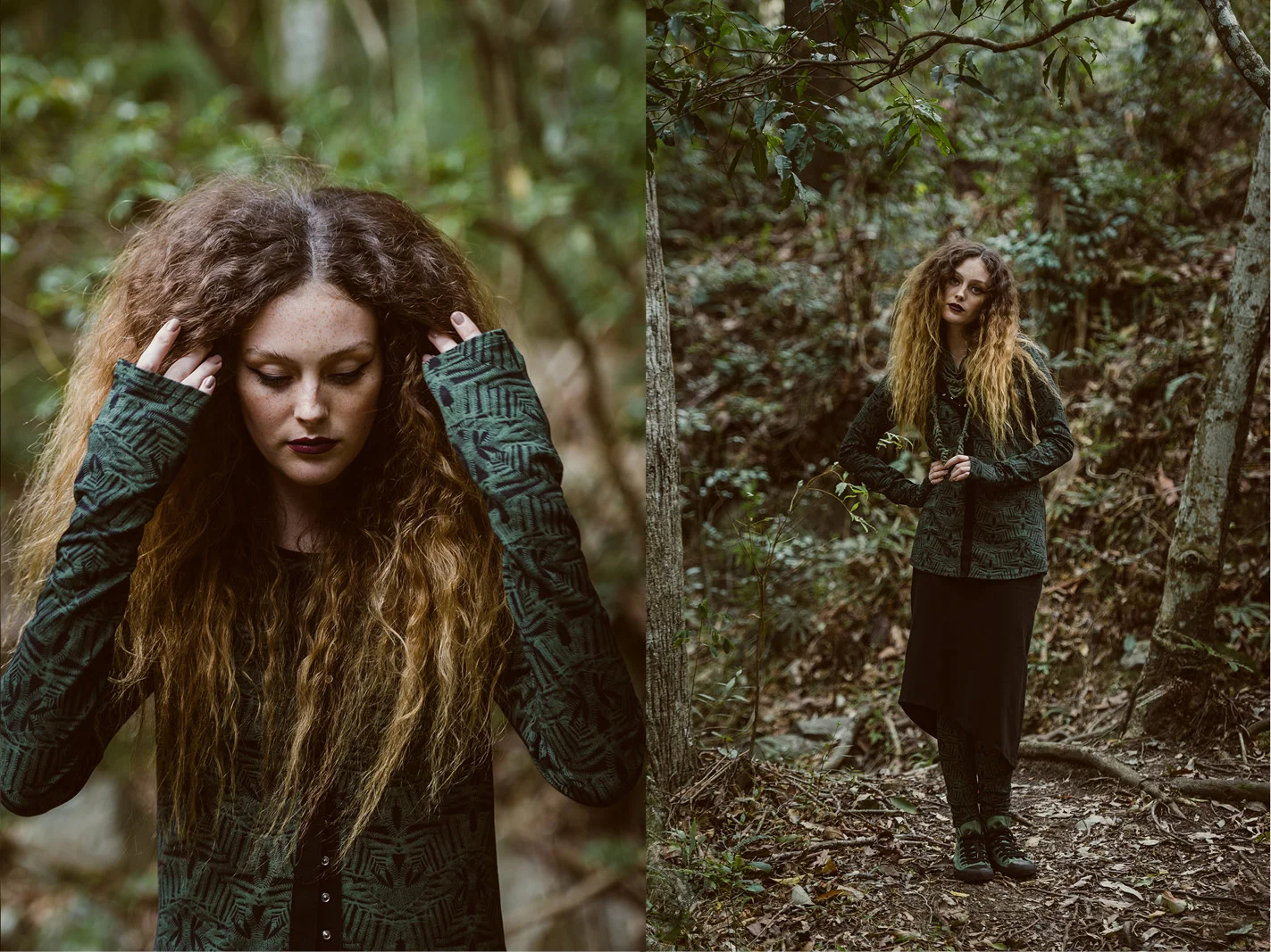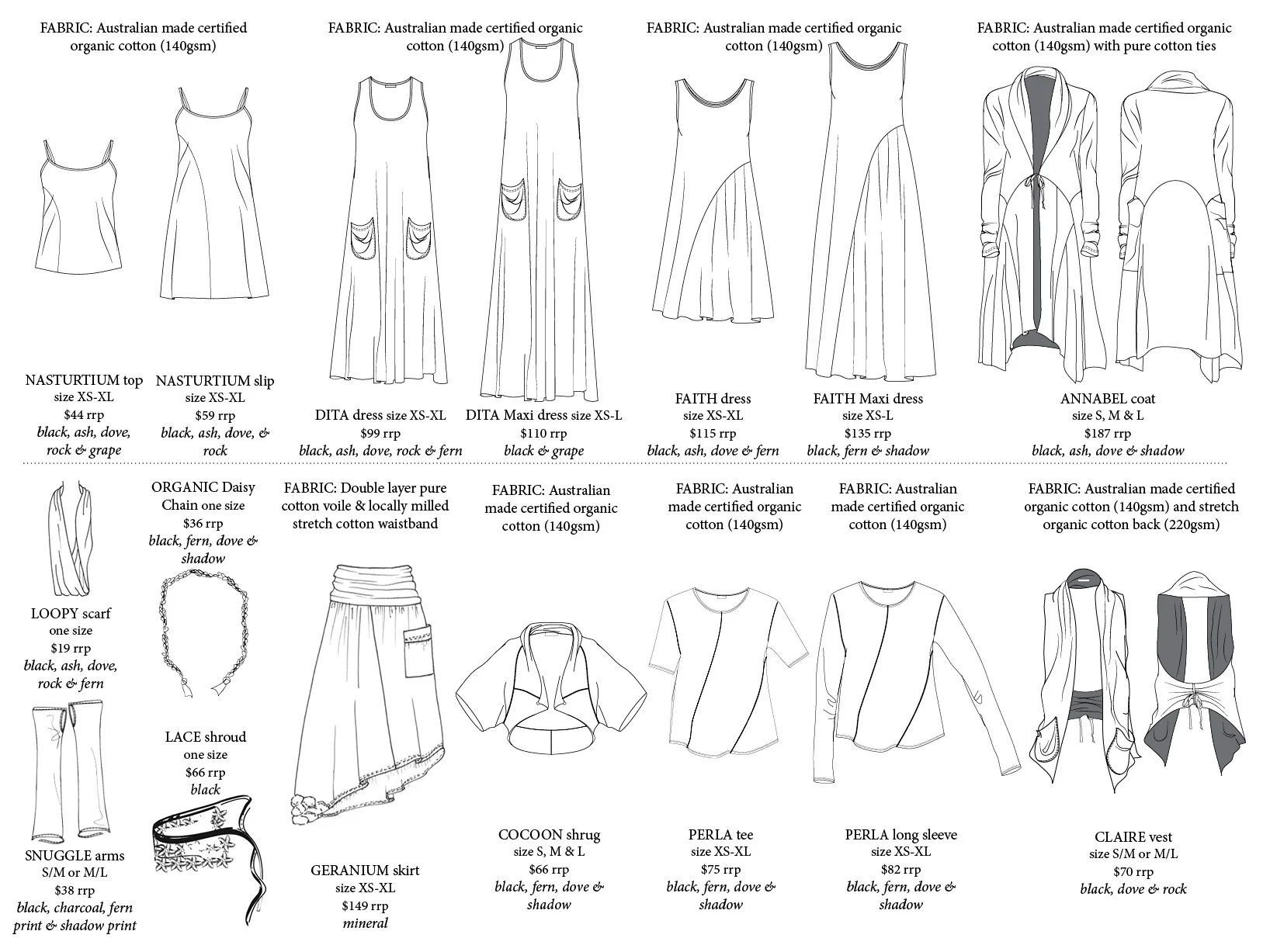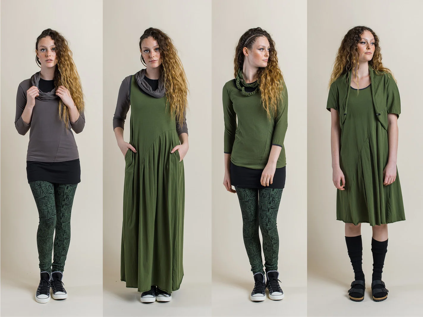 LEFT: Josie tunic (black), Robin top (rock) and Fern print legging (fern) MIDDLE LEFT: Faith Maxi dress (fern) over Josie tunic (black) and Robin top (rock) MIDDLE RIGHT: Swivel top (fern) over Josie tunic (black) and Fern print legging (fern) with Organic Daisy chain (fern) RIGHT: Faith dress (fern) with Cocoon shrug (fern)