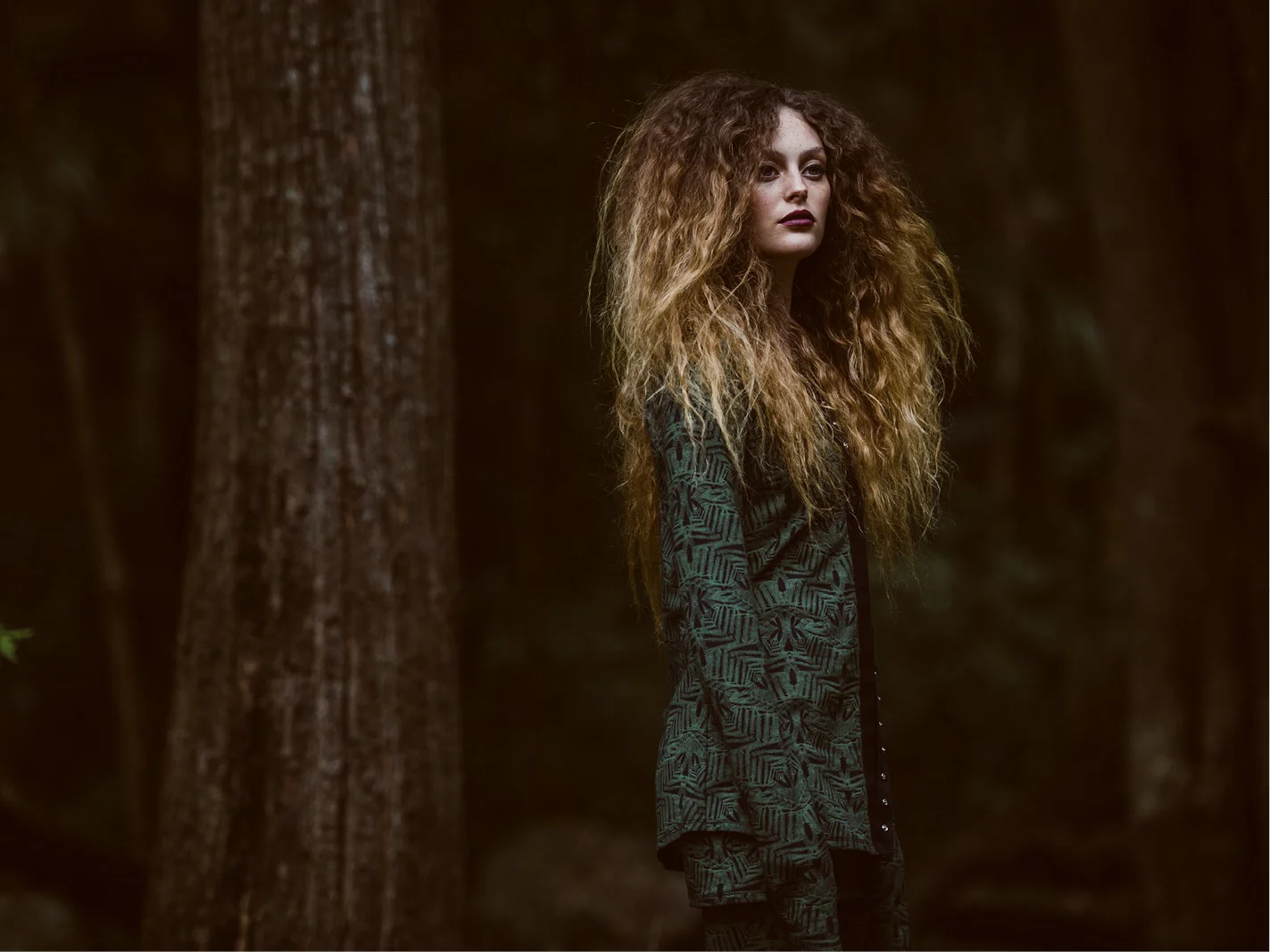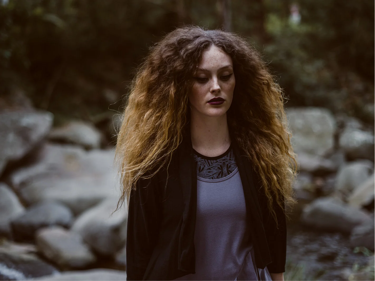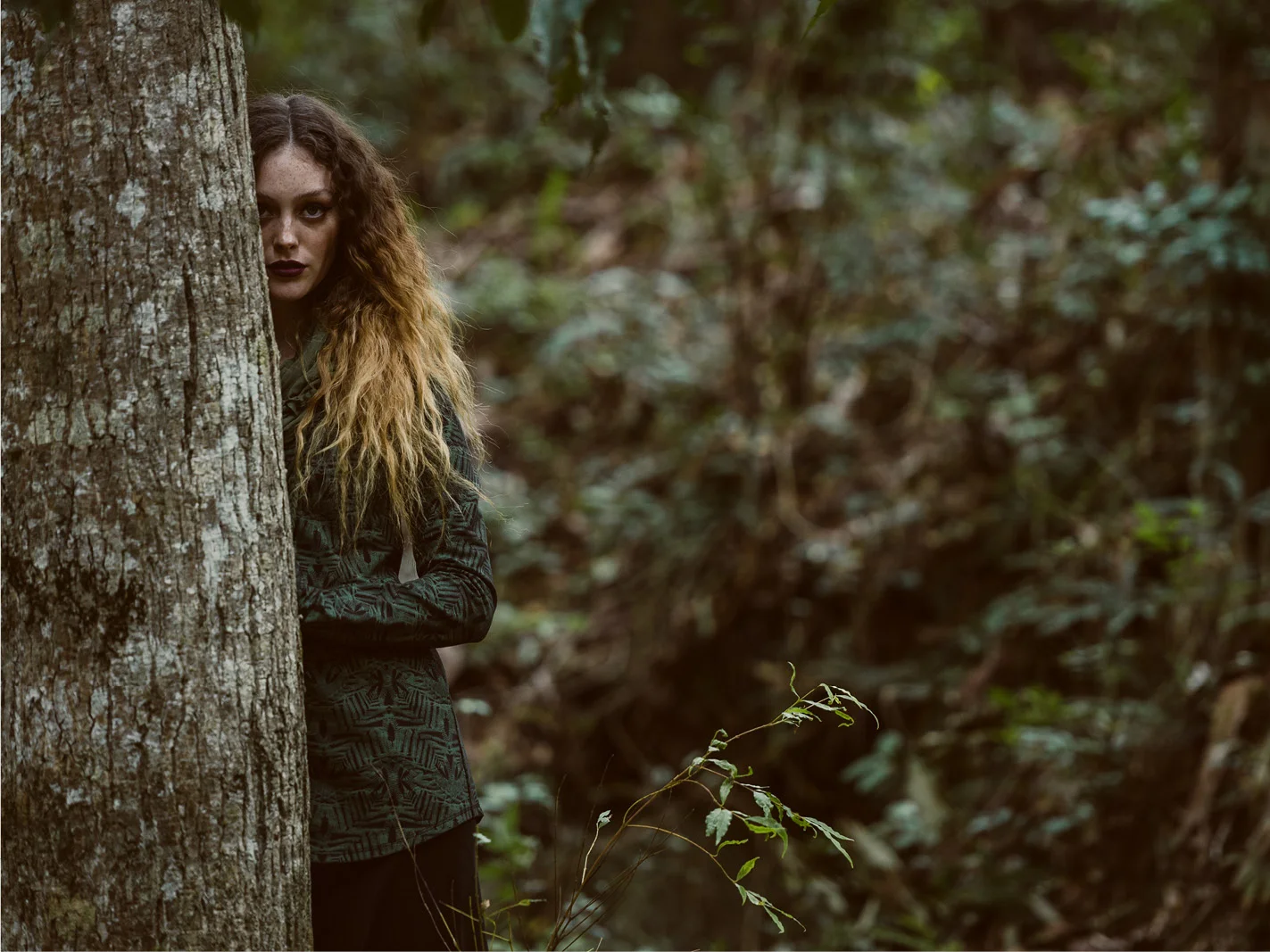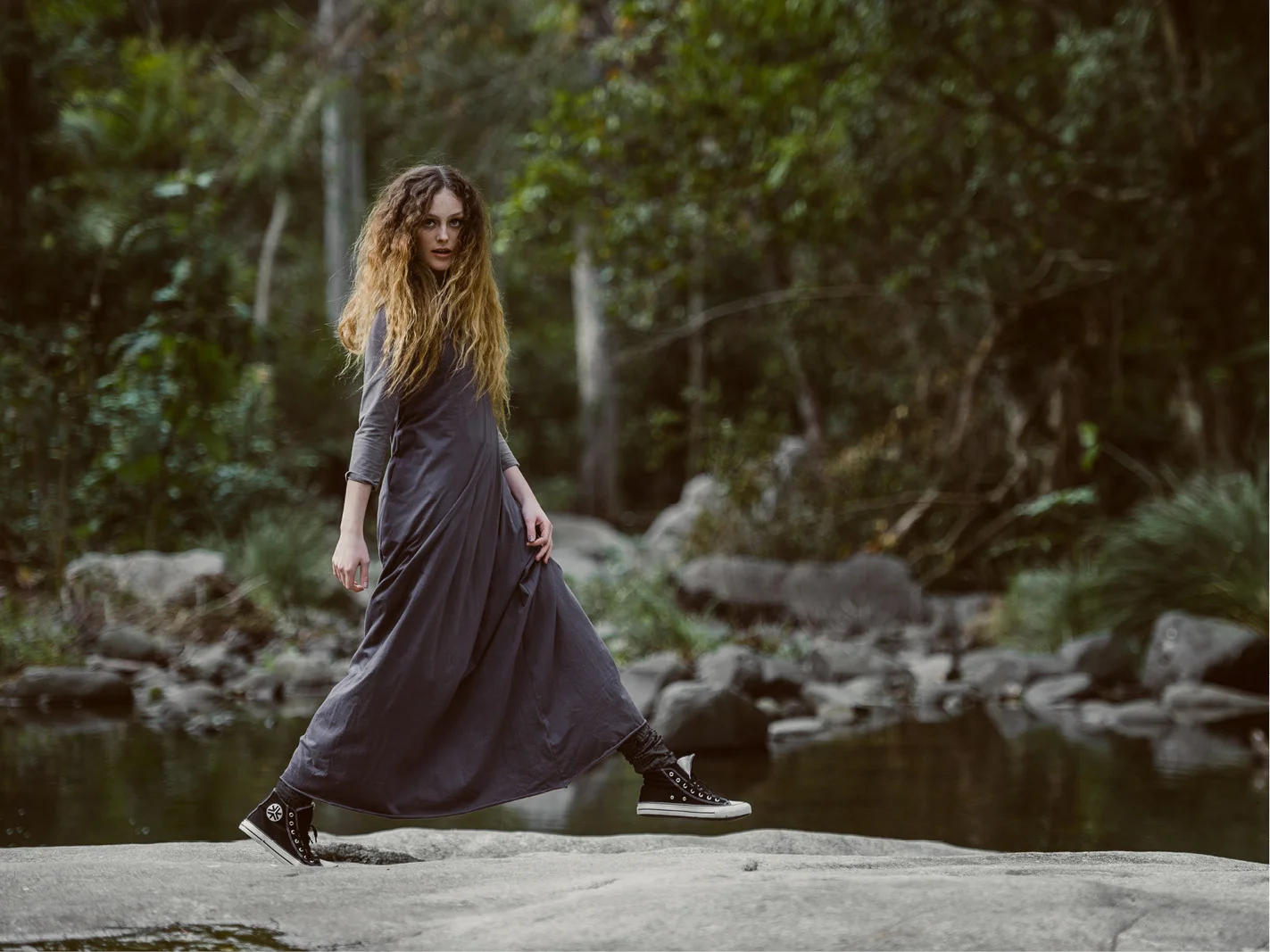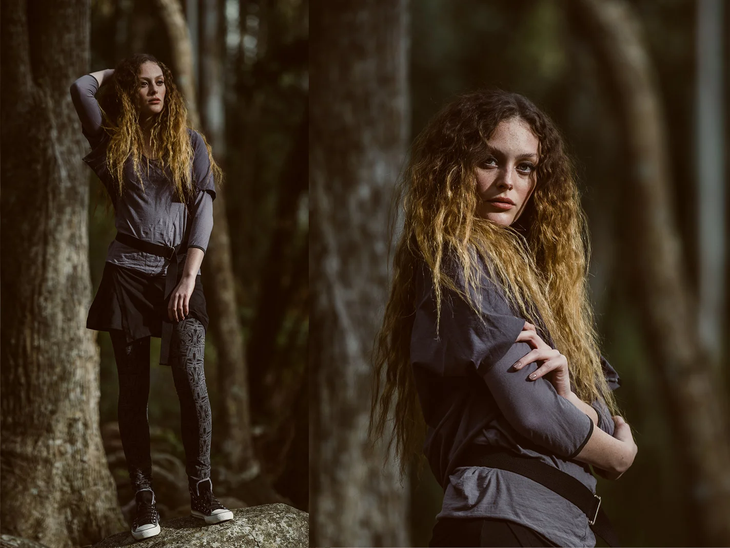 LEFT: Josie tunic (black), Robin top (rock) and Fern print legging (fern) MIDDLE LEFT: Faith Maxi dress (fern) over Josie tunic (black) and Robin top (rock) MIDDLE RIGHT: Swivel top (fern) over Josie tunic (black) and Fern print legging (fern) with Organic Daisy chain (fern) RIGHT: Faith dress (fern) with Cocoon shrug (fern)