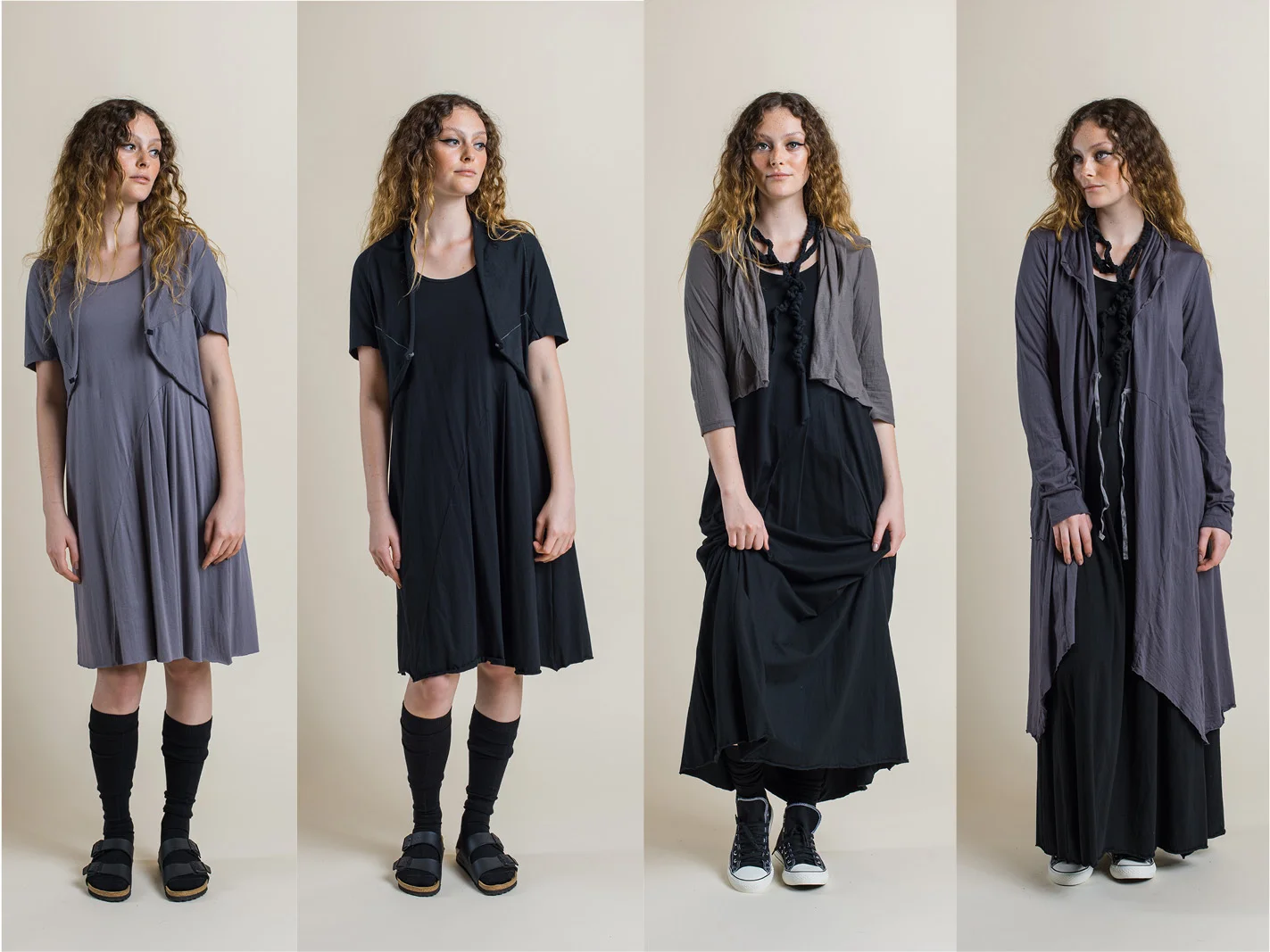 LEFT: Annabel coat (black), Fern print legging (shadow) MIDDLE LEFT: Tansy top (black) and Maggie skirt/pant (black/shadow print) MIDDLE RIGHT: Tansy top (black), Camille long cardi (shadow print) with Jezabel skirt (dove) and Fern print legging (shadow) RIGHT: Perla long sleeve top (black) and Maggie skirt/pant (black/shadow print)