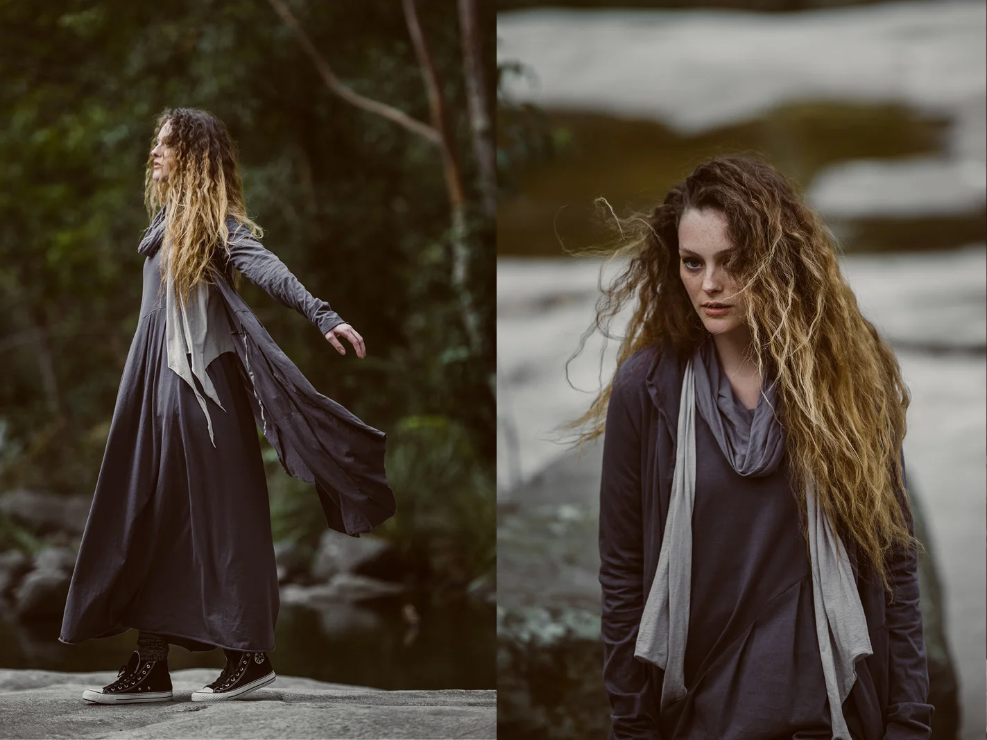 Faith maxi dress (shadow) with Robin top (dove), Quirk 3/4 shrug (ash) added in left image