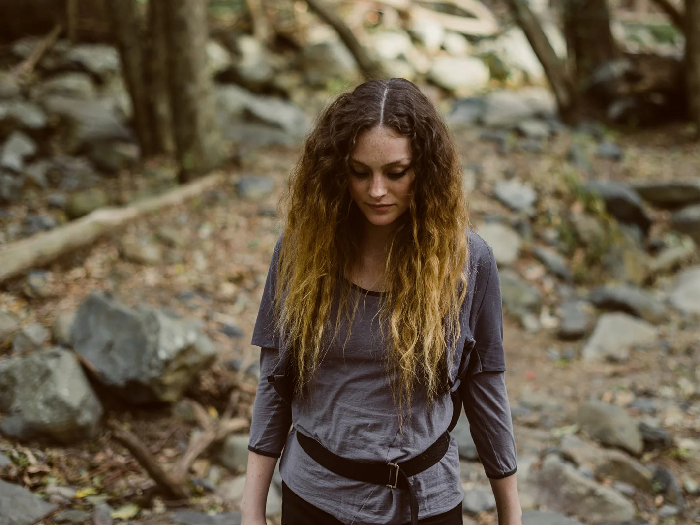 Swivel top (dove) and Cocoon shrug (shadow) with Slider belt