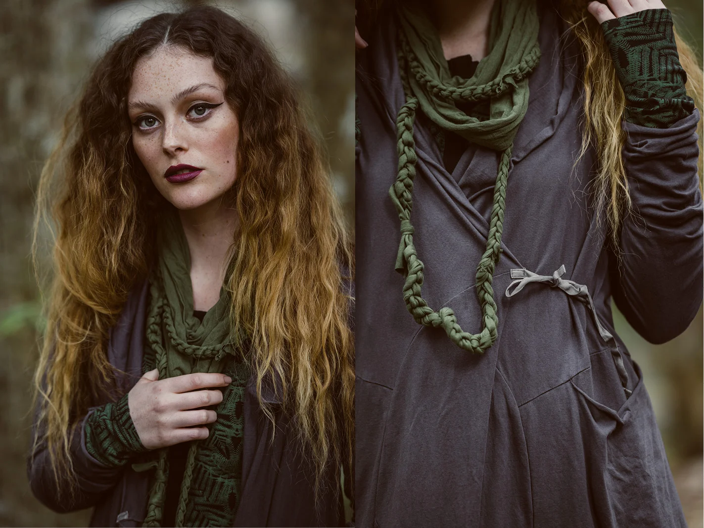 Annabel coat (shadow) with Camille long cardi (fern print), Loopy scarf (fern) and Organic Daisy chain (fern)